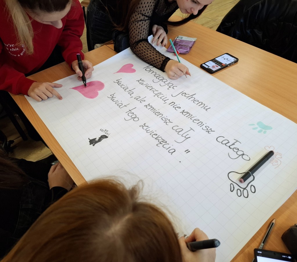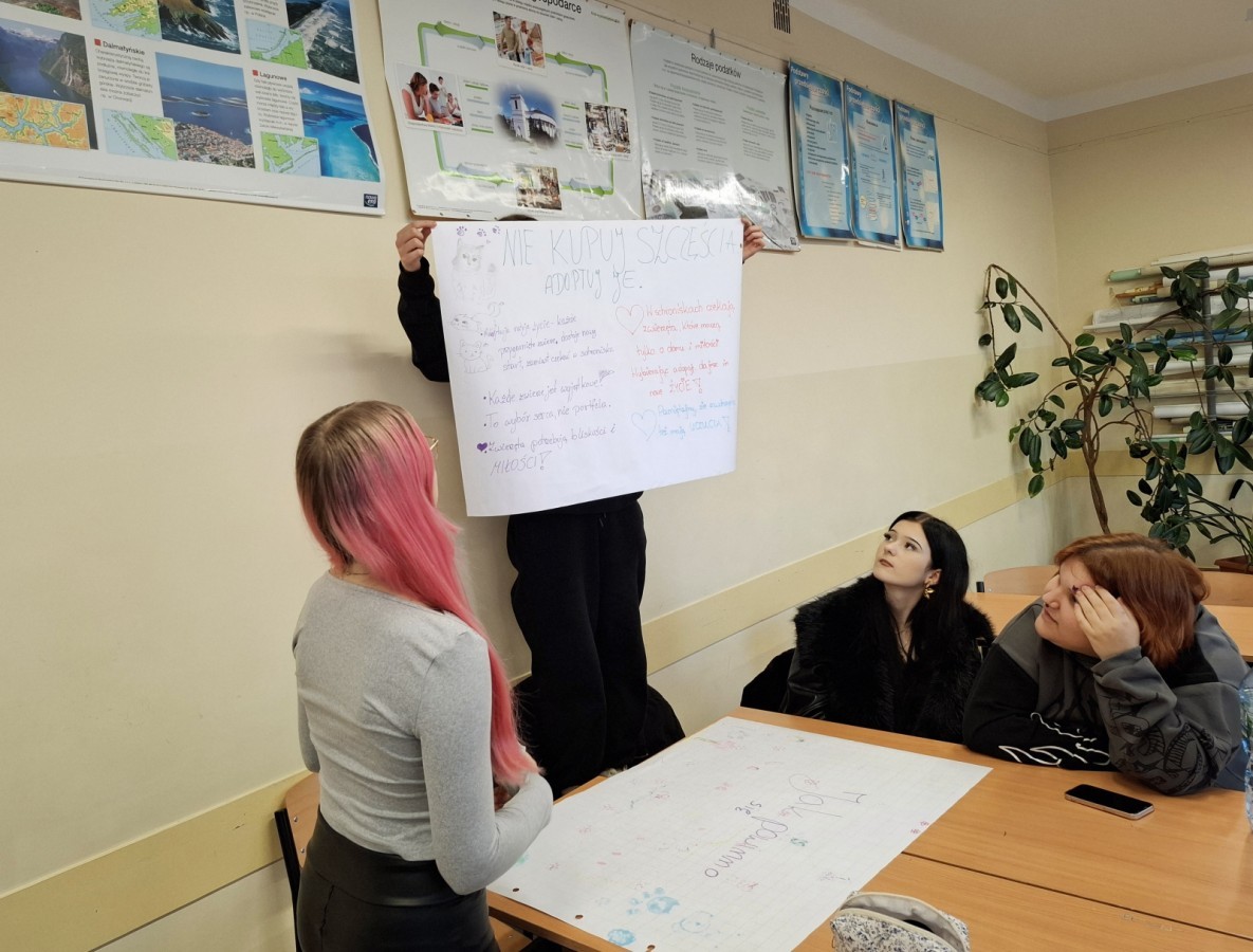 Podczas zajęć omawiane były potrzeby zwierząt, obowiązki opiekunów. W części warsztatowej uczniowie planowali także własne działania wolontarystyczne i pomocowe dla zwierząt, projektując plakaty.
