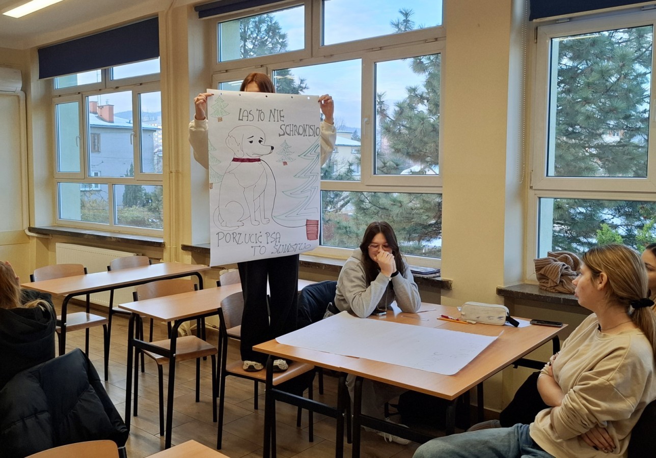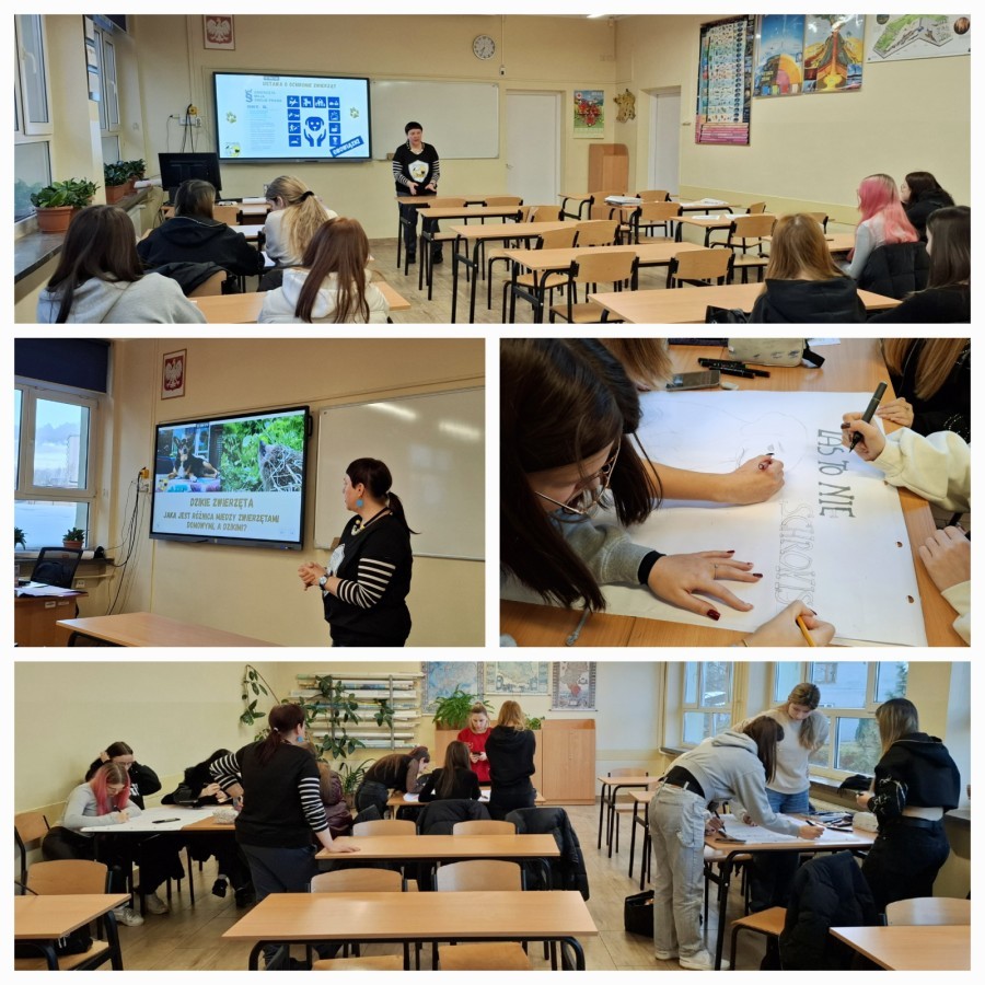 Po raz kolejny w dniach: 27 listopada br. (kl. 1Fa) i 3 grudnia br. (kl. 2Fb) młodzież naszej szkoły brała udział w zajęciach edukacyjnych jak dbać o zwierzęta pt. "Przyjaciel na całe życie". Jest to projekt edukacyjny realizowany przez Fundację „Świat w Naszych Rękach" i „Fundację Psia Ekipa", we współpracy z Urzędem Miejskim w Bielsku-Białej. Projekt promuje postawę odpowiedzialności za posiadane zwierzę, dotyczy tematyki standardów utrzymania zwierząt i zapobiegania ich bezdomności. Głównym celem działań edukacyjnych jest zmniejszenie ilości zwierząt które trafiają do schroniska, na ulicę, czy do kojca.