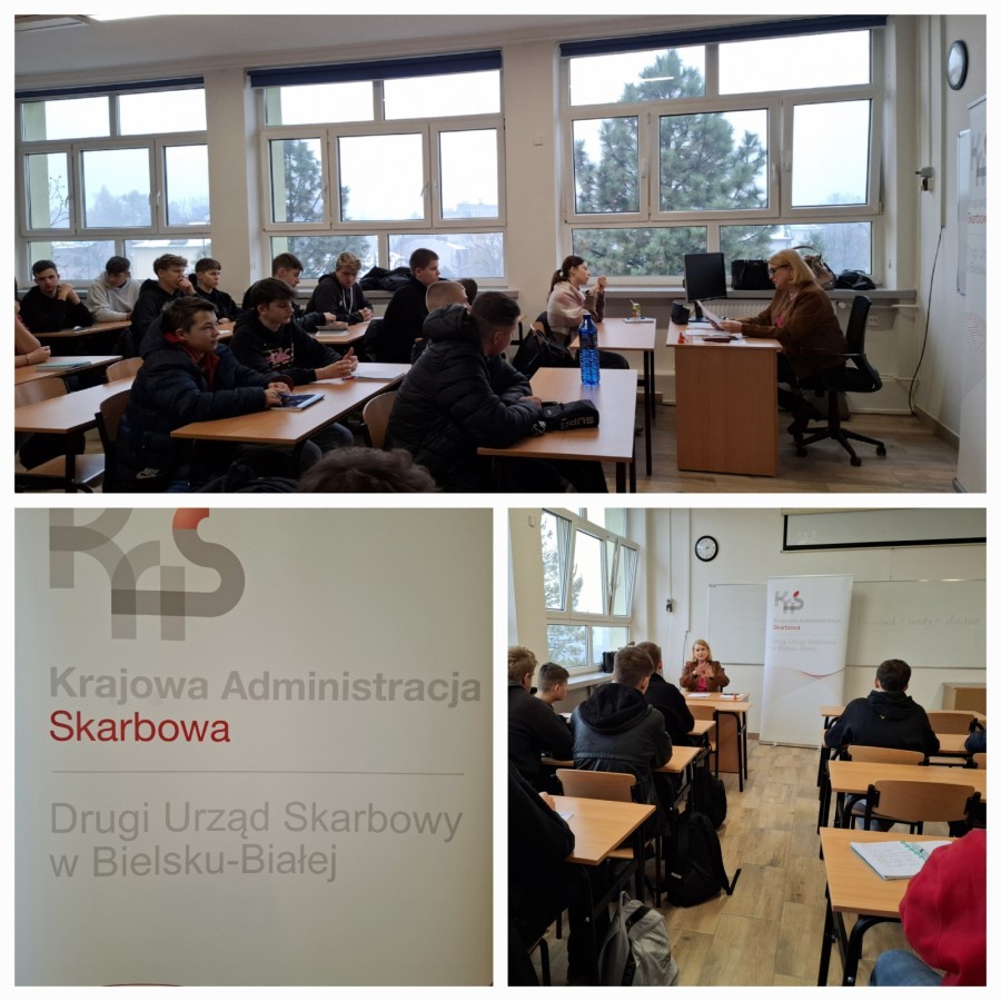 Uczniowie klasy 3Xa 25 listopada 2025 roku w ramach przedmiotu kształtowanie kompetencji zawodowych uczestniczyli w lekcji prowadzonej przez pracownika Drugiego Urzędu Skarbowego w Bielsku-Białej - p. Elżbietę Błaszczyk. Tematem prelekcji było omówienie systemu podatkowego obowiązującego w Polsce, formy opodatkowania i możliwości wyboru rodzaju opodatkowania. Podczas spotkania młodzież dowiedziała się o prowadzeniu własnej działalności gospodarcze, składaniu deklaracji i zeznań przez przedsiębiorców, instalacji kas fiskalnych i rejestracji do VAT. Uczniowie zostali poinformowani także o konieczności wdrażania Krajowego Systemu e-Faktur (KSeF) od 1 lutego 2026r. przez przedsiębiorców oraz wystawiających faktury w Polsce. Wdrożenie KSeF służy cyfryzacji procesów fakturowania oraz księgowania faktur oraz będzie pozwalał unikać błędów przy ich wystawianiu.