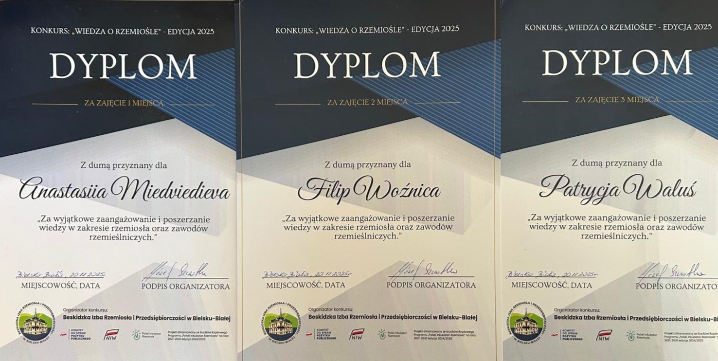 Uczniowie naszej szkoły wykazali się największą wiedzą o rzemiośle i zajęli w Konkursie wszystkie miejsca na podium. Najwyższe wyniki zdobyli: Anastasiia Miedviedieva z kl. 1Fa, Filip Woźnica z kl. 2Ma oraz Patrycja Waluś z kl. 3Ca. Gratulujemy !!!