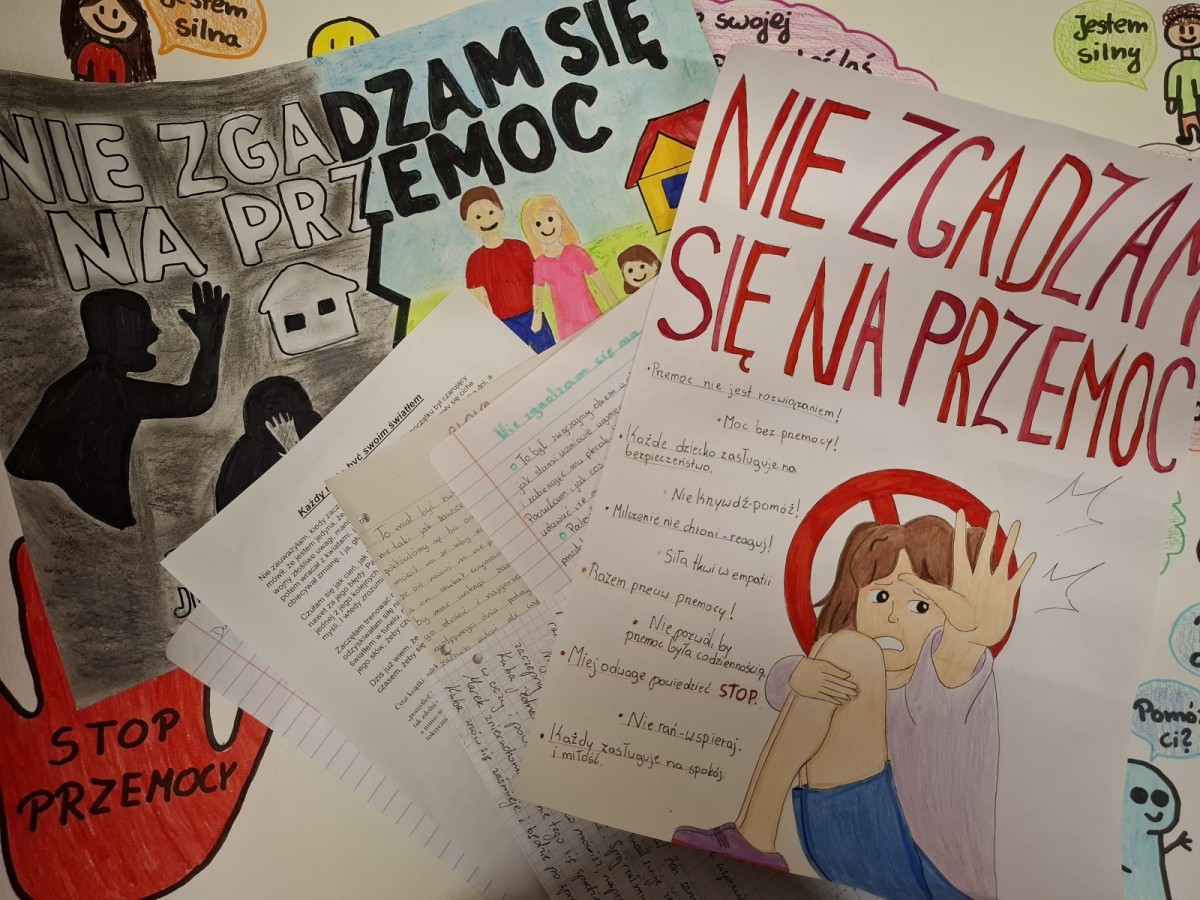 Uczniowie naszej szkoły wzięli udział w szkolnym konkursie plastycznym i literackim, które pozwoliły im na dwóch różnych płaszczyznach wyrazić swoje emocje nt. "NIE ZGADZAM SIĘ NA PRZEMOC" w ramach ogólnopolskiej kampanii DZIECIŃSTWO BEZ PRZEMOCY. Prace uczniów były pełne wrażliwości i osobistych interpretacji, a konkurs stał się dla nich okazją do wzmocnienia poczucia własnej sprawczości i budowania świadomości własnych praw. Dzięki działaniom edukacyjnym takich jak ww. konkurs, czy zajęcia edukacyjne w ramach zajęć z wychowawcą, a poświęcone tematowi przemocy rówieśniczej kampania zyskała kolejną wartościową odsłonę.