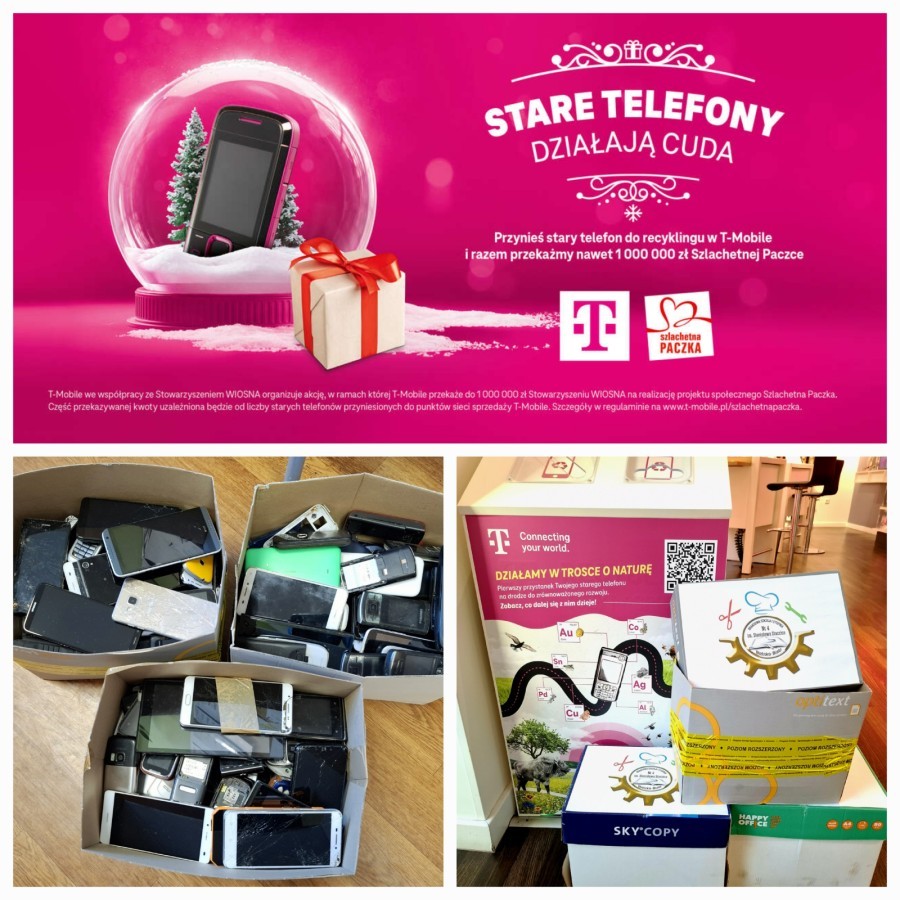 Przystępując do akcji T-Mobile i Szlachetnej Paczki "STARE TELEFONY DZIAŁAJĄ CUDA" połączyliśmy dwa ważne cele wychowawcze młodzieży. Pomogliśmy w recyklingu niepotrzebnych już starych telefonów, których odzysk posłuż do produkcji nowych urządzeń. Jednocześnie każdy stary telefon, to dodatkowe środki przekazane SZLACHETNEJ PACZCE. Przyniesione przez uczniów i przekazane do salonu T-Mobile przez naszą szkołę 3 kartony niedziałających telefonów z pewnością znacząco wpłynęło na wielkość kwoty wsparcia projektu społecznego SZLACHETNA PACZKA, gdyż im więcej telefonów, tym większe wsparcie.
